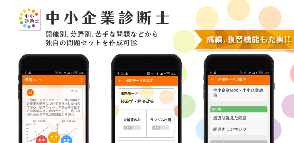 開催別、分野別、苦手な問題などから独自の問題セットを作成することができ重要な項目を徹底的に勉強できます。復習用にカラー付箋(ふせん)を使用したり、間違い回数が多い問題だけを解けるのでスキマ時間に、いつでも、どこでも効率的な学習が可能です。成績機能も充実しており、解答率、正解率、分野ごとの分析されます。