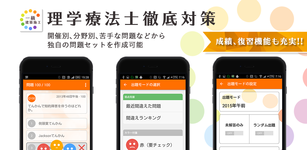 開催別、分野別、苦手な問題などから独自の問題セットを作成することができ重要な項目を徹底的に勉強できます。復習用にカラー付箋(ふせん)を使用したり、間違い回数が多い問題だけを解けるのでスキマ時間に、いつでも、どこでも効率的な学習が可能です。成績機能も充実しており、解答率、正解率、分野ごとの分析されます。