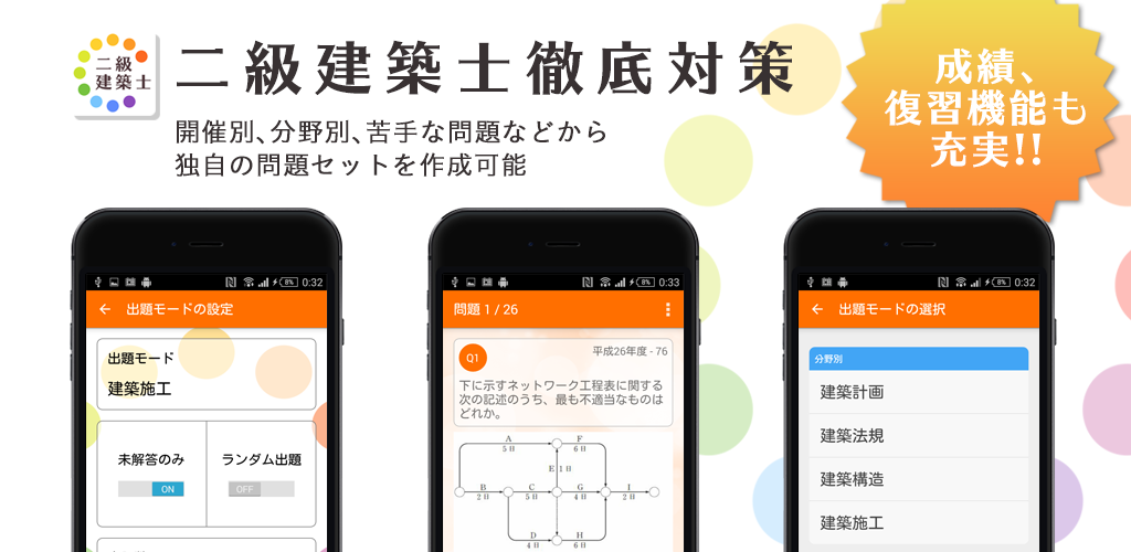 開催別、分野別、苦手な問題などから独自の問題セットを作成することができ重要な項目を徹底的に勉強できます。復習用にカラー付箋(ふせん)を使用したり、間違い回数が多い問題だけを解けるのでスキマ時間に、いつでも、どこでも効率的な学習が可能です。成績機能も充実しており、解答率、正解率、分野ごとの分析されます。