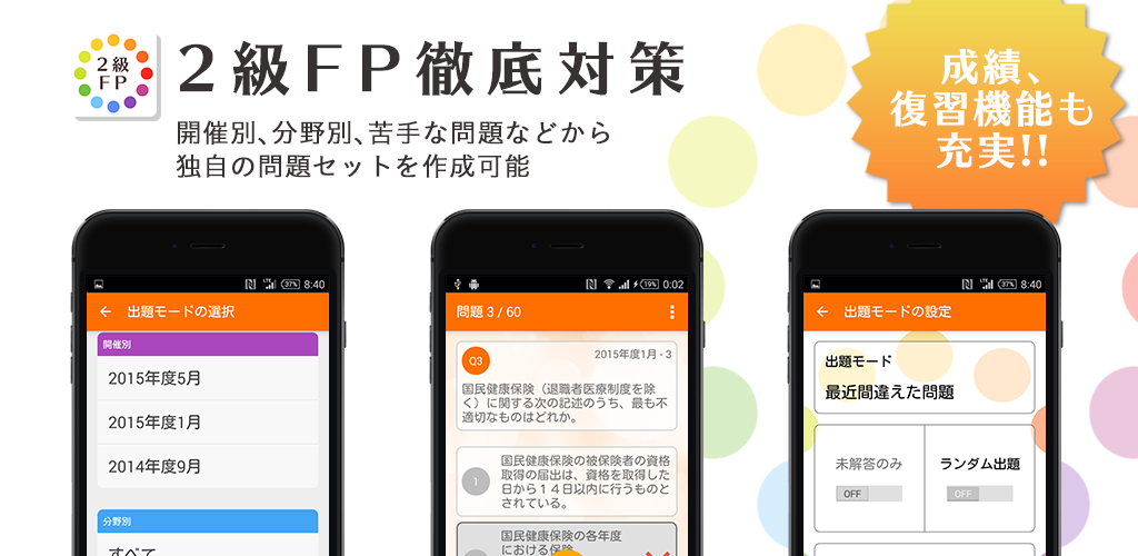 開催別、分野別、苦手な問題などから独自の問題セットを作成することができ重要な項目を徹底的に勉強できます。復習用にカラー付箋(ふせん)を使用したり、間違い回数が多い問題だけを解けるのでスキマ時間に、いつでも、どこでも効率的な学習が可能です。成績機能も充実しており、解答率、正解率、分野ごとの分析されます。